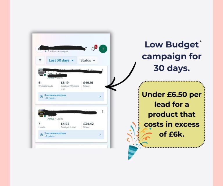Budgets less than £25 per day are not recommended unless you are running very localised ads (i.e. event or a local service without a funnel). However, they may still be viable, or I can offer you a Power Hour 1:1 for Meta Ads Training to help you better manage your own campaign.